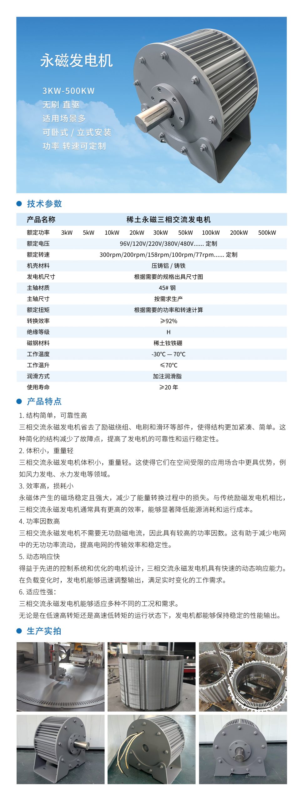 稀土永磁发电机是一种新型的发电机,其定子结构与普通的交流发电机的结构非常相似,转子结构与交流发电机的最大不同是在转子上放有高质量的永磁体磁极,不需要线围绕组和电刷等装置,采用稀土永磁后还可以增大气隙磁密,提高发电转换率。