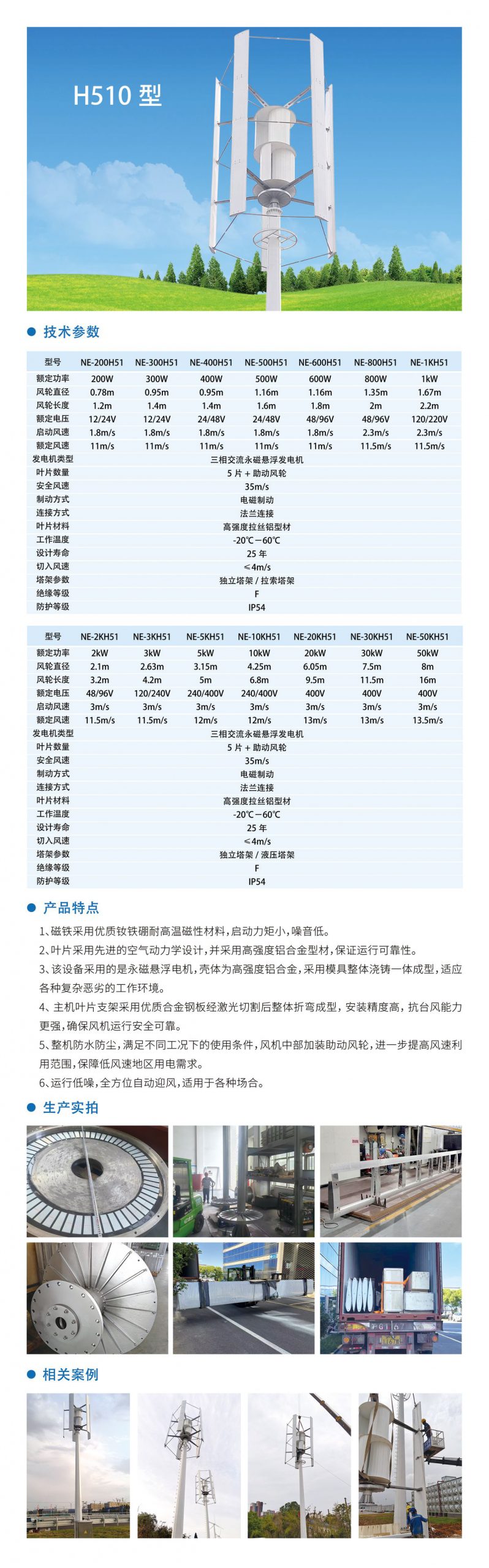Ø 风轮叶片采用新工艺拉丝铝模具经精密制造成型,配以优化的空气动力学结构设计,风能利用系数高,增加了年发电量。