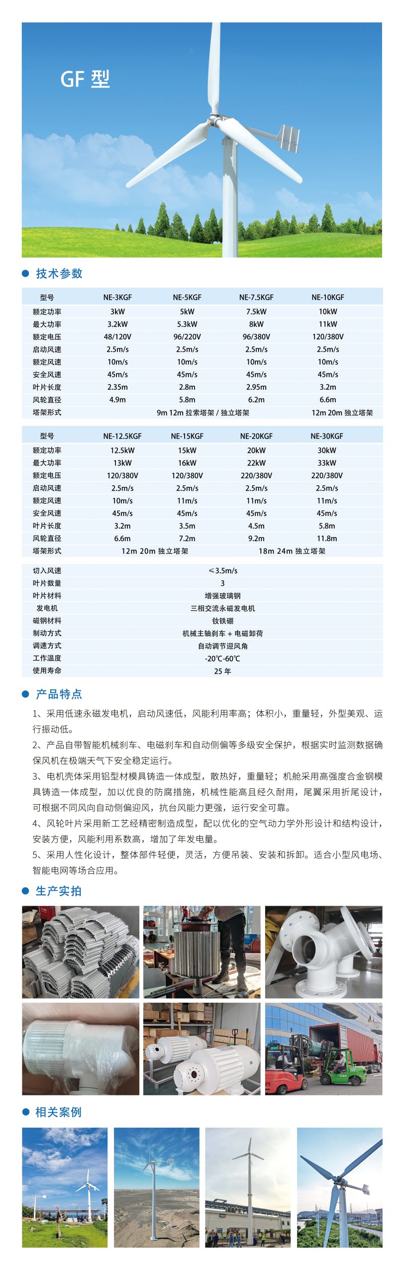 Ø 风轮叶片采用新工艺经精密制造成型,配以优化的空气动力学外形设计和结构设计,安装方便,风能利用系数高,增加了年发电量。